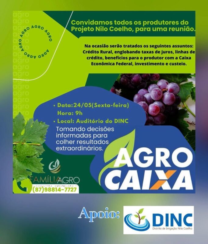 O Distrito de Irrigação Nilo Coelho (DINC), em parceria com a Caixa Econômica Federal (CEF), convida todos os produtores rurais do Projeto Senador Nilo Coelho, para o evento Agro Caixa, que será realizado no dia 24 de maio, às 9:00 da manhã, no auditório da sede do DINC, localizado na Vila CS-01 zona rural de […]