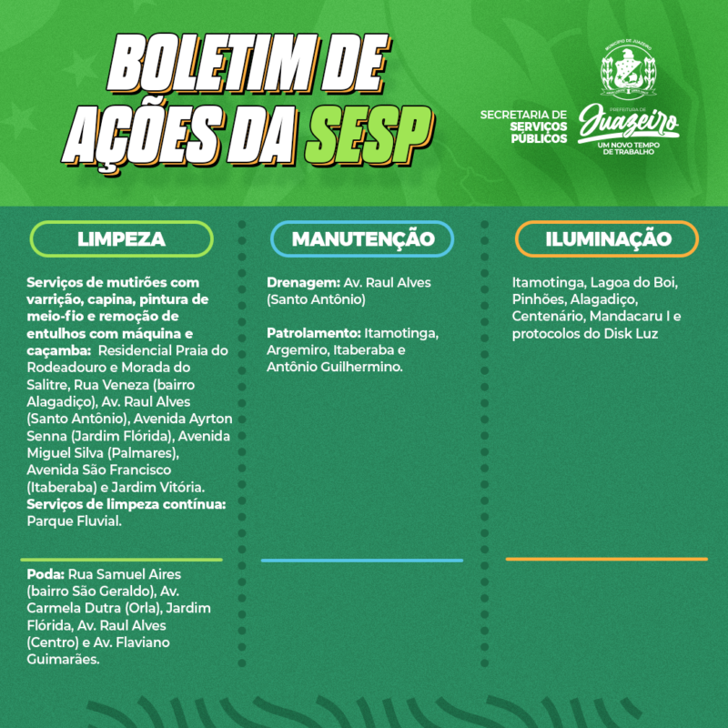 A Prefeitura de Juazeiro informa boletim semanal com ações das equipes de limpeza, iluminação e manutenção da Secretaria de Serviços Públicos (Sesp). As equipes já estão atuando com serviços de poda, varrição, capina, retirada de entulhos, reparos da iluminação, limpeza de canais e patrolamento. De acordo com a programação da semana, as equipes da Sesp […]