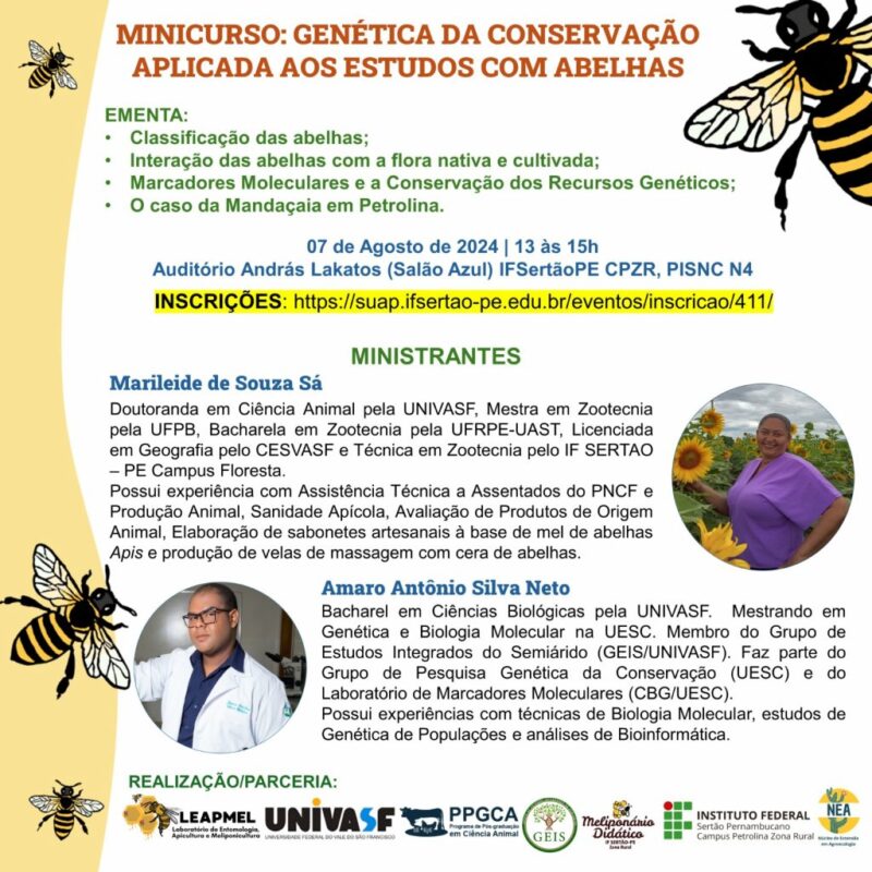O campus Petrolina Zona Rural do IFSertãoPE promove, na próxima quarta-feira (7 de agosto), através do Núcleo de Extensão em Agroecologia, o minicurso “Genética da Conservação aplicada aos estudos com abelhas”. O evento é gratuito e aberto aos interessados. O minicurso será ministrado pela doutoranda em Ciência Animal (Univasf), Marileide de Souza Sá, e pelo […]