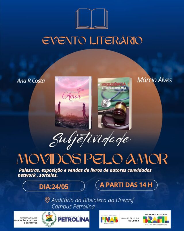 Acontecerá no próximo sábado, dia 24 de maio de 2025, a partir das 14 horas, no auditório da Biblioteca da UNIVASF, Campus Petrolina, a realização do projeto literário: Subjetividade, Movidos pelo Amor. Este evento é produzido por Ana R. Costa, produtora cultural, escritora e revisora, piauiense radicada em Petrolina e tem o propósito de fomentar […]