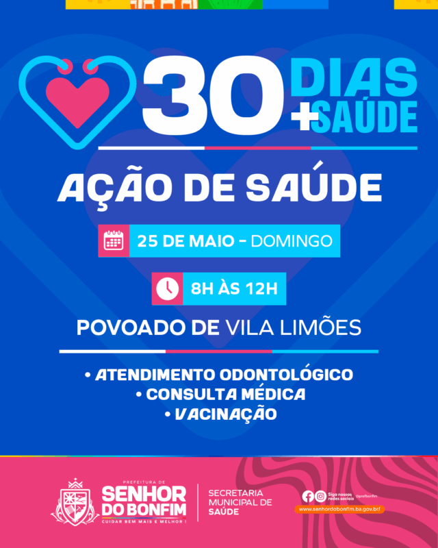 Como parte da programação do projeto 30 Dias + Saúde, a Prefeitura de Senhor do Bonfim, por meio da Secretaria Municipal de Saúde, promove neste domingo, 25 de maio, mais uma importante ação de saúde no povoado de Vila Limões, das 8h às 12h. A população contará com atendimento odontológico, consulta médica e vacinação, reforçando […]