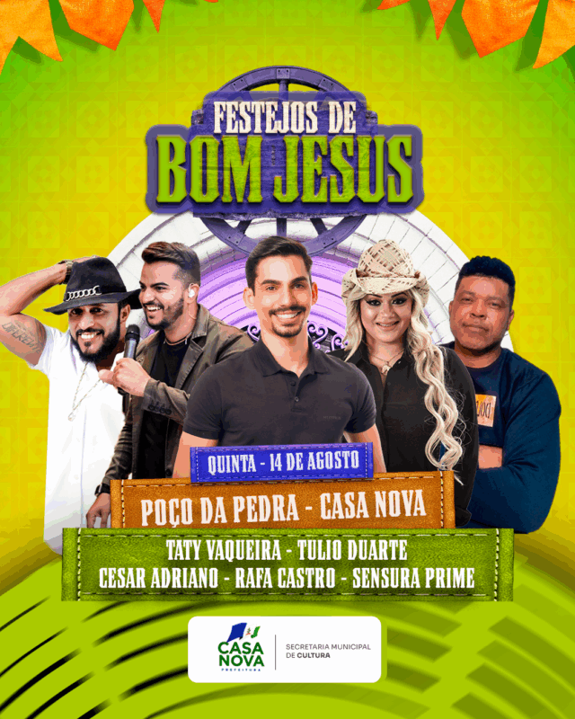 A comunidade de Poço da Pedra estará em festa na próxima quinta-feira (14). A Prefeitura de Casa Nova, através da Secretaria de Cultura, vai realizar a festividade do Bom Jesus na localidade. Vai ter muito forró, piseiro e muitos ritmos com as atrações: Túlio Duarte, César Adriano, Taty Vaqueira, Sensura Prime e Rafa Castro, a […]