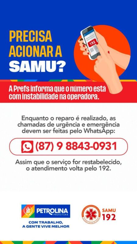 A Secretaria Municipal de Saúde informa a população de Petrolina que o telefone 192, do Serviço de Atendimento Móvel de Urgência (SAMU), apresenta instabilidade na operadora e aguarda reparo na rede telefônica. As ligações para o serviço de urgência e emergência do SAMU estão acontecendo através de ligação via WhatsApp no número (87) 9 8843-0931. […]