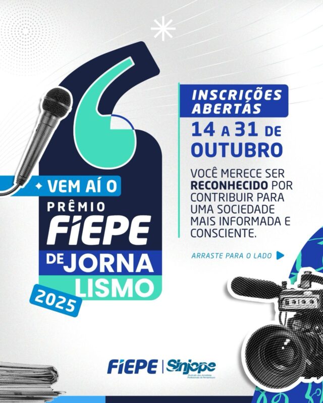 Jornalistas profissionais e com registros especiais de repórter fotográfico e de repórter cinematográfico de todo o Brasil têm até esta sexta-feira (31) para fazer a inscrição no Prêmio FIEPE de Jornalismo. O concurso jornalístico realizado pela Federação das Indústrias do Estado de Pernambuco, para dar maior visibilidade ao setor industrial, vai premiar os melhores trabalhos […]