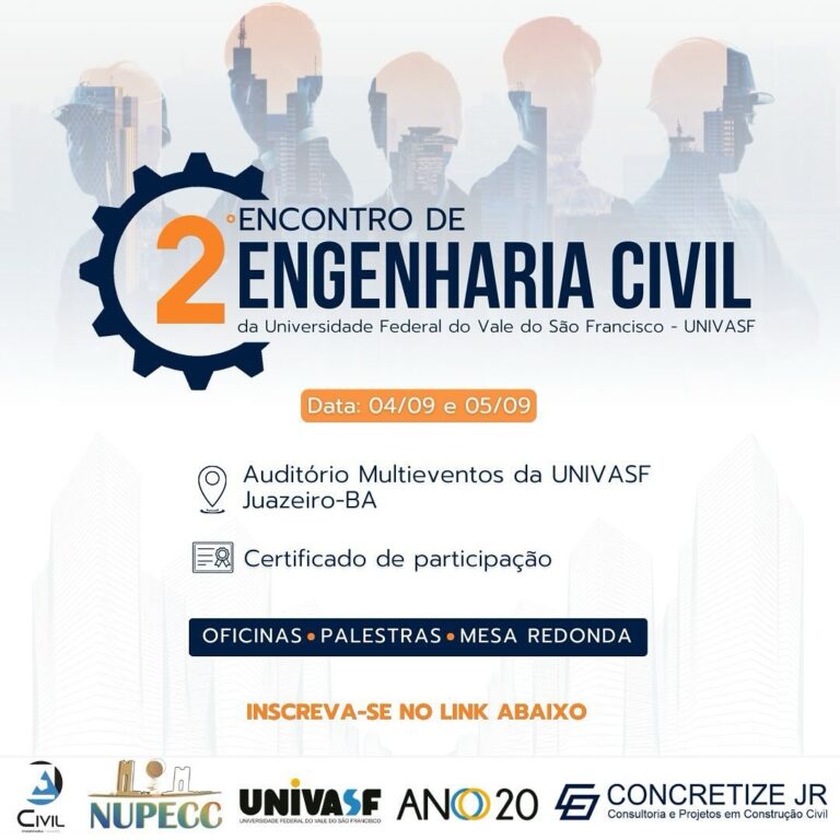 De acordo com o professor do Ccivil e coordenador do evento, Wagner Carvalho Santiago, esta edição irá possibilitar a complementação da formação de estudantes e a atualização profissional de engenheiros que já atuam no mercado. Ele destaca que a inciativa também é importante por proporcionar “a difusão de conhecimentos com potencial de melhorar a produtividade e qualidade da indústria da construção civil no Vale do São Francisco e a consolidação do curso de Engenharia Civil da Univasf como polo de excelência regional”. A programação completa do encontro será disponibilizada em breve no Instagram do curso.