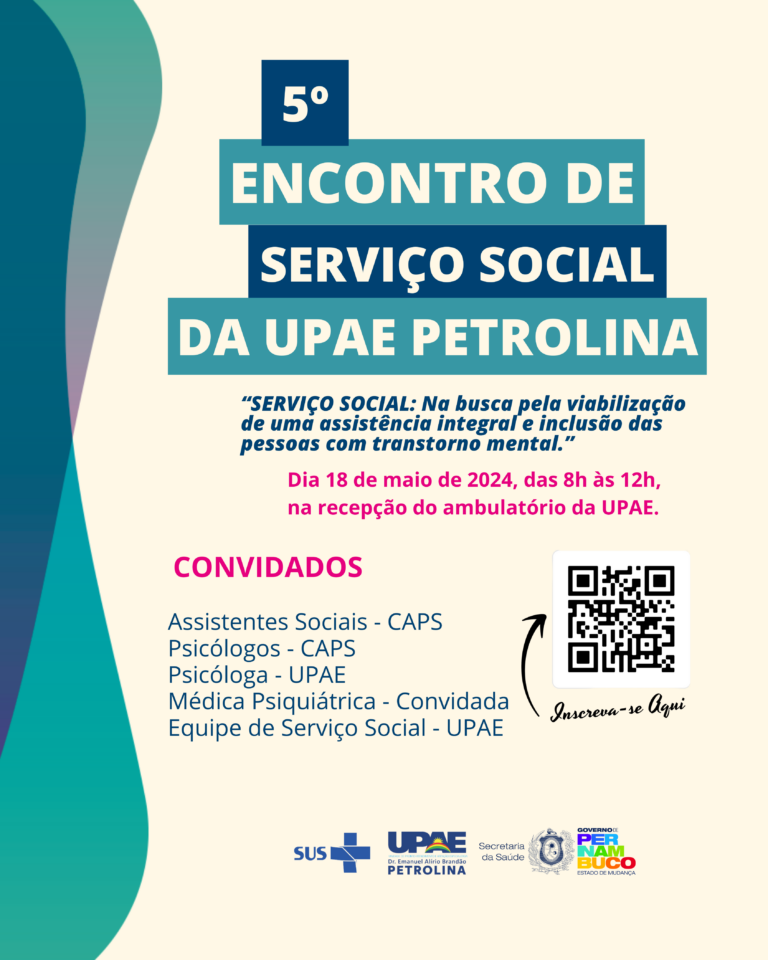 Neste sábado (18), das 8h às 12h, a Unidade de Pronto Atendimento e Atenção Especializada de Petrolina irá realizar o 5º Encontro de Serviço Social. O evento, que acontecerá na recepção do ambulatório do serviço, traz como tema central ‘SERVIÇO SOCIAL: Na busca pela viabilização de uma assistência integral e inclusão das pessoas com transtorno mental’. As inscrições continuam abertas e podem ser feitas até o dia do evento.