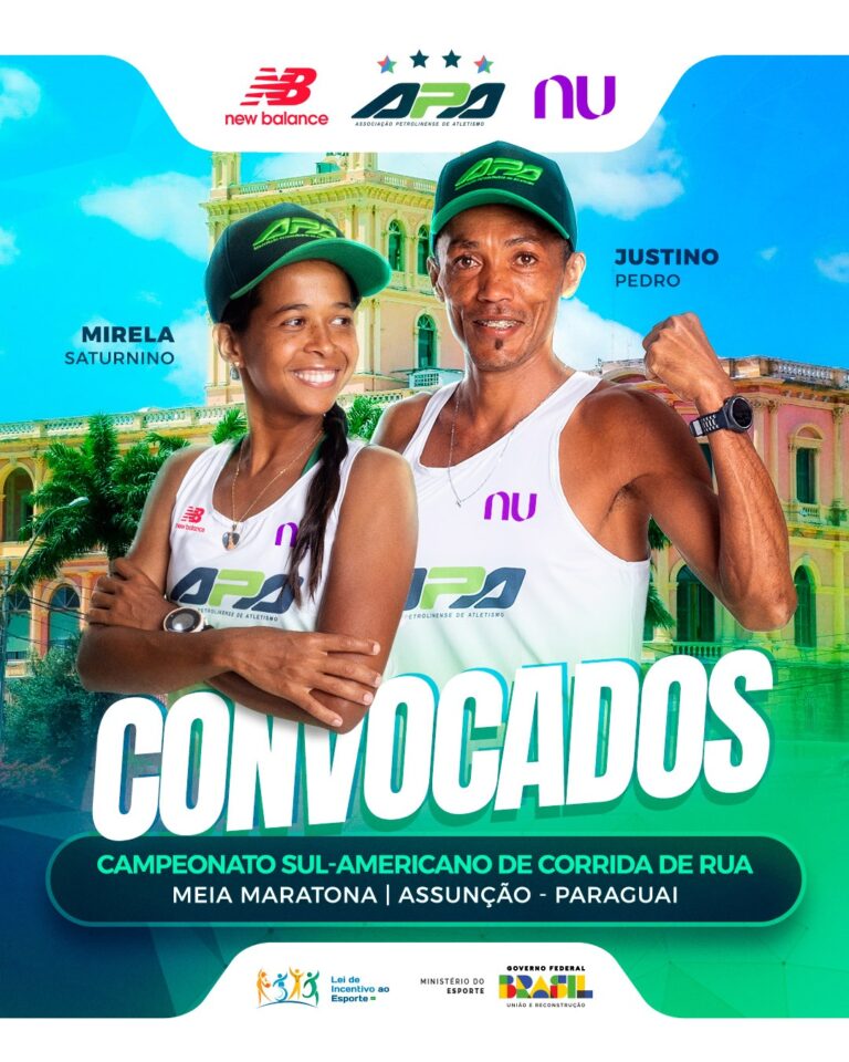 Os pernambucanos Justino Pedro da Silva e Mirela Saturnino foram convocados para representar o Brasil no Campeonato Sul-Americano de Corrida de Rua, que será realizado no dia 26 de maio, em Assunção, no Paraguai. Os atletas da Associação Petrolinense de Atletismo (APA) vão disputar a prova da meia maratona (21km).