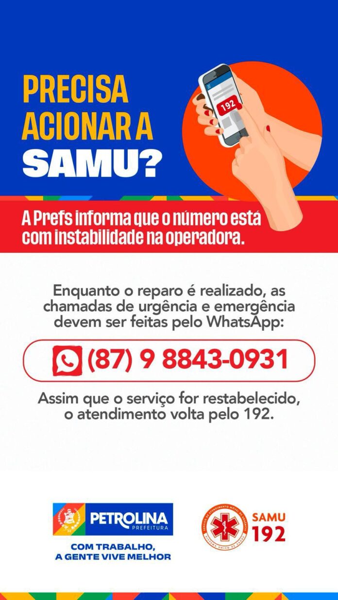 A Secretaria Municipal de Saúde informa a população de Petrolina que o telefone 192, do Serviço de Atendimento Móvel de Urgência (SAMU), apresenta instabilidade na operadora e aguarda reparo na rede telefônica. As ligações para o serviço de urgência e emergência do SAMU estão acontecendo através de ligação via WhatsApp no número (87) 9 8843-0931.