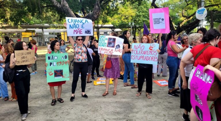 Nesta segunda-feira, Grupos de mulheres e movimentos sociais realizaram um protesto contra o Projeto de Lei 1904/2024. O protesto começou por volta das 16h, na Praça do Derby, área central do Recife.