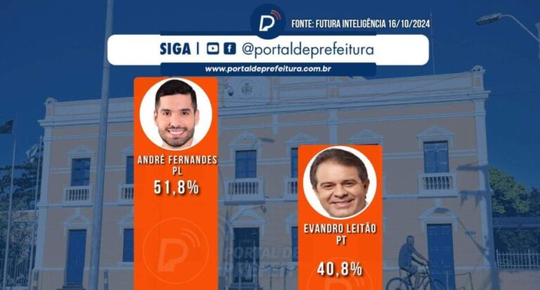 O deputado federal André Fernandes (PL), está à frente na corrida para a Prefeitura de Fortaleza no segundo turno, com 51,8% das intenções de voto, segundo pesquisa da Futura Inteligência, solicitada pela 100% Cidades e divulgada nesta quarta-feira, 16 de outubro.