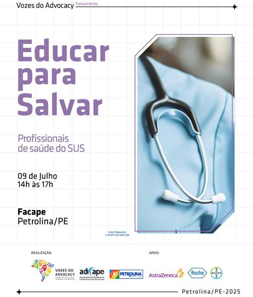 No próximo dia 9 de julho, profissionais de saúde e agentes comunitários participarão de uma capacitação sobre diabetes na Faculdade de Petrolina (Facape). A ação faz parte do Projeto ‘Educar para Salvar’, promovido pelo Vozes do Advocacy em parceria com a Adifape (Associação dos Diabéticos e Familiares de Petrolina), Secretaria de Saúde do município e Hospital Universitário (HU)-Univasf.
