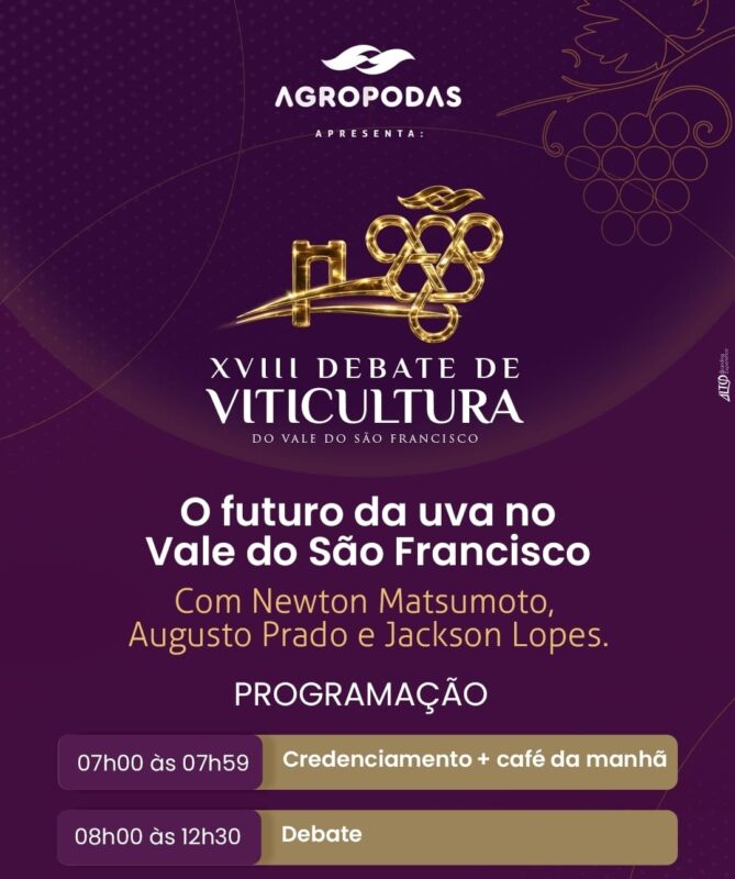 No dia 21 de março de 2026, sábado, o XVIII Debate da Viticultura do Vale do São Francisco, um dos principais encontros técnicos voltados ao fortalecimento da cadeia produtiva da uva na região. Com o tema “O futuro da uva no Vale do São Francisco”, o evento reunirá produtores, gerentes de fazendas e especialistas para […]