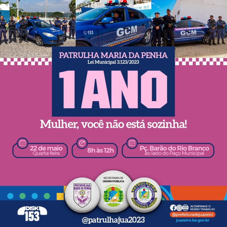 A Prefeitura de Juazeiro celebra o 1º aniversário da Patrulha Maria da Penha, da Guarda Civil Municipal (GCM) que ocorrerá na nesta quarta-feira (22). O evento será na Praça Barão do Rio Branco, ao lado do Paço Municipal, a partir das 8h. O evento, com o tema “Mulher, Você Não Está Sozinha”, é aberto ao público e tem o objetivo de destacar os serviços prestados pela Patrulha ao município, bem como reforçar a importância da denúncia de casos de violência contra a mulher.