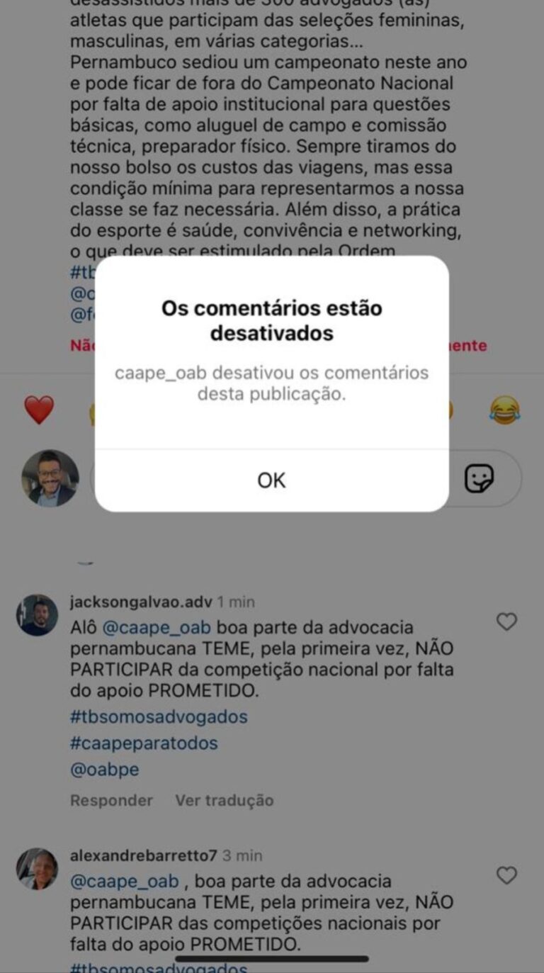 “Não adianta apagar os comentários! Boa parte da advocacia pernambucana TEME, pela primeira vez, NÃO PARTICIPAR da competição nacional por falta do apoio PROMETIDO no início do ano!”, comentou o usuário @joaogsantos.adv.