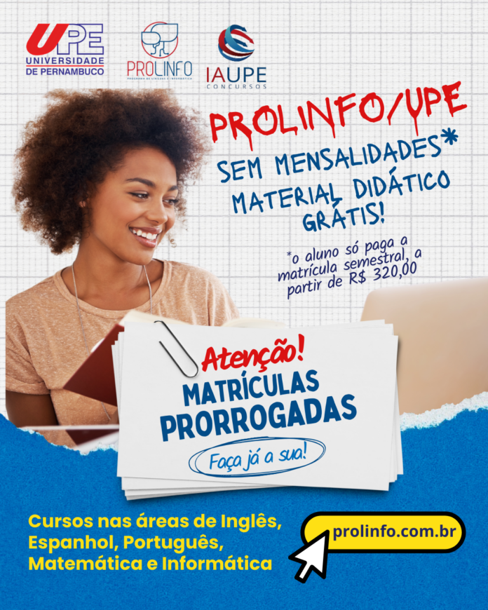 Programa de Línguas e Informática da Universidade de Pernambuco – está prorrogando as inscrições para cursos de Inglês para crianças (entre 7 e 12 anos), jovens, adultos, público da Melhor Idade, Inglês para Mestrado e Doutorado, além de Espanhol (jovens, adultos e Melhor Idade), Informática (crianças entre 07 e 12 anos), jovens e adultos, Excel, Illustrator, Photoshop, Corel Draw, Canva, Figma, Português e Matemática (para concursos e vestibulares – Enem, SSA, Escolas de Aplicação, IF, etc).