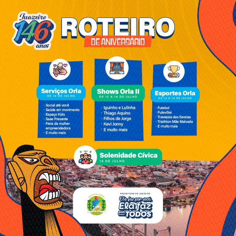 O juazeirense já está contando os minutos para celebrar os 146 anos de aniversário da cidade. A festa, organizada pela Prefeitura de Juazeiro, sob a administração da prefeita Suzana Ramos, vai trazer shows musicais, campeonatos esportivos e serviços sociais, de saúde, educação, entre outros, e promete movimentar a Orla II da cidade de 12 e 15 de julho.
