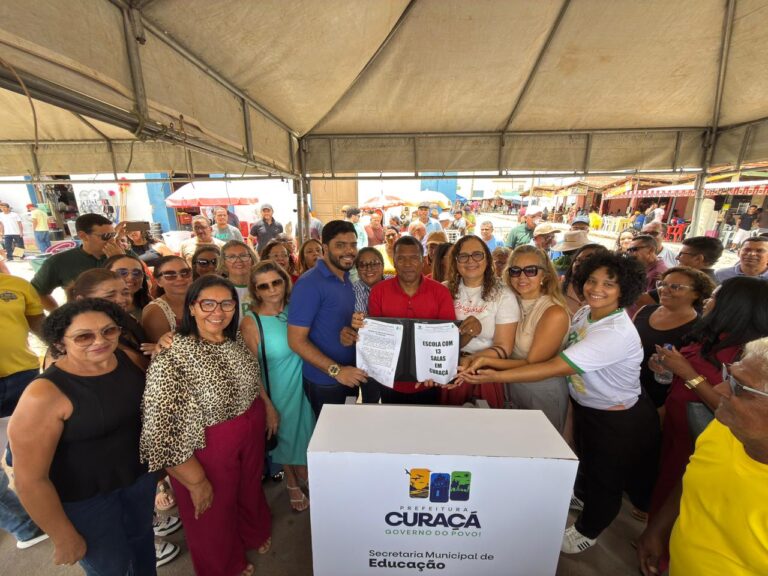 Após a conquista do Selo Prata na Educação, o prefeito Murilo Bomfim assinou, nesta segunda-feira (16), a ordem de serviço para a construção de uma nova escola em Curaçá. A assinatura ocorreu em frente ao Mercado Municipal e reuniu a comunidade, vereadores e secretários da gestão.