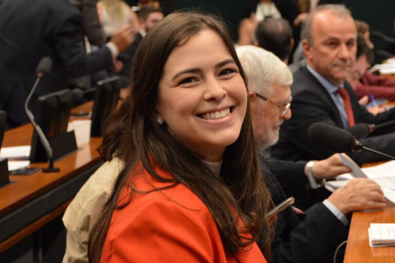 A deputada federal Maria Arraes (SD-PE) comemora a aprovação na Comissão de Constituição e Justiça e de Cidadania (CCJ) da Câmara dos Deputados do projeto de lei (PL) que autoriza o monitoramento por tornozeleira eletrônica de acusados de violência doméstica.