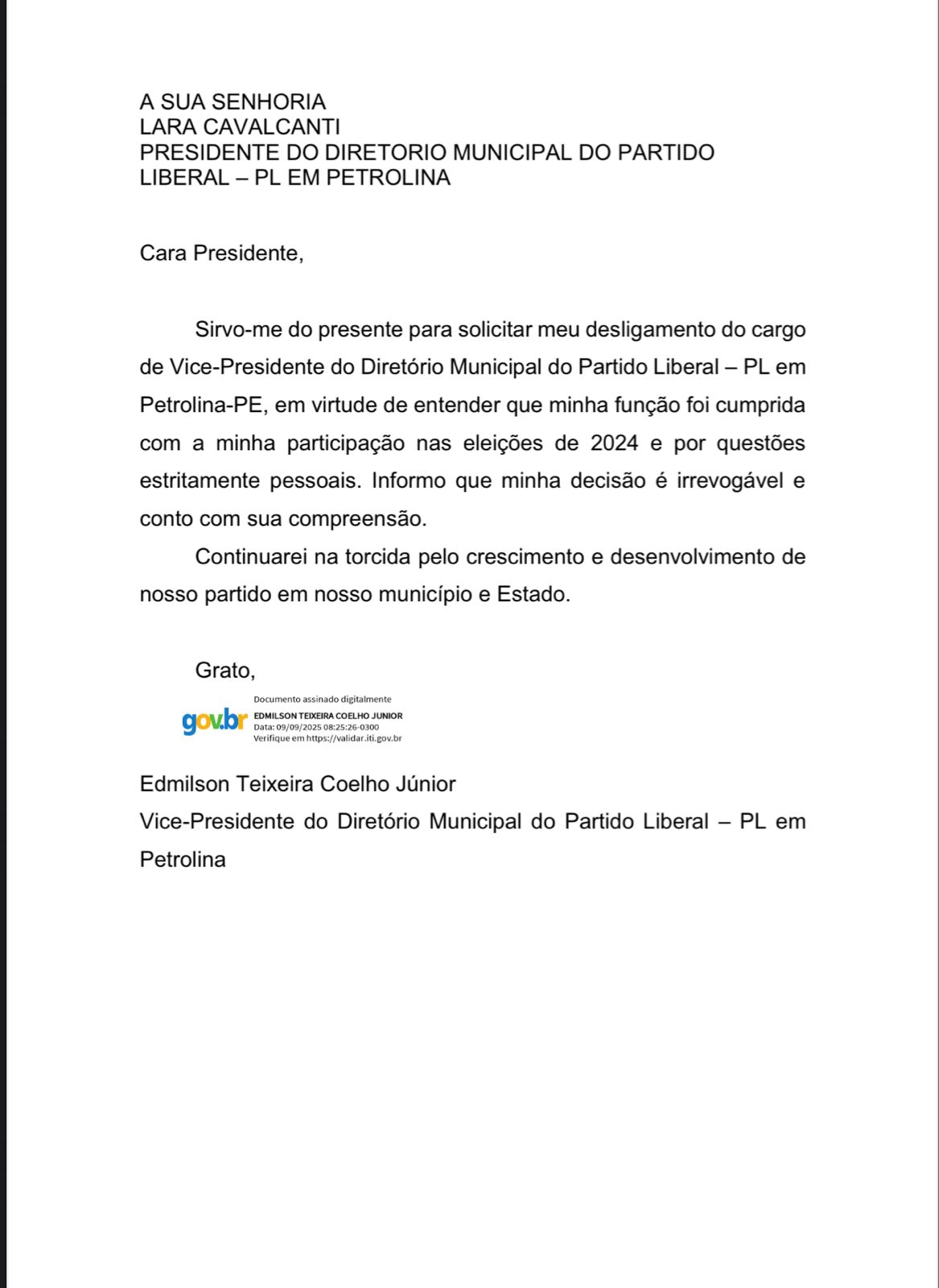 “Eu fui convidado por Dhiego Serra para ajudá-lo a montar o partido, consegui fazer uma chapa competitiva de Vereadores e lançar um candidato a prefeito. Participei de mais de cem encontros com possíveis candidatos a vereadores e conseguimos garantir que Lara Cavalcanti saísse candidata no PL, que a Lara foi minha indicação a Dhiego Serra. Assumi a vice-presidência a convite de Serra e Lara, participei da construção do plano de governo e considero que a minha colaboração ao partido já foi encerrada. Estou me desligando por entender que minha missão foi cumprida e preciso focar em meus projetos pessoais. Além disso, sinto que não consigo mais contribuir com os caminhos do partido.”
