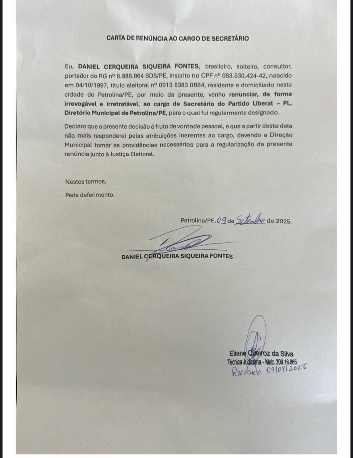 Essa semana, recebemos a informação de que o 1º Secretário Daniel Cerqueira e o Vice-Presidente Edmilson Teixeirado Diretório Municipal do Partido Liberal na cidade renunciaram aos seus cargos.