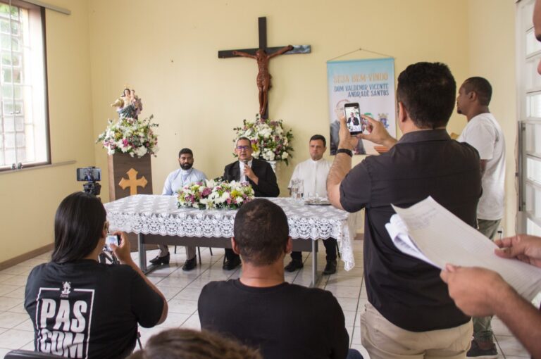 Na manhã desta sexta-feira (23/08), o Salão Papa Francisco da Paróquia Nossa Senhora das Grotas foi espaço para um momento histórico e especial para Juazeiro. Durante a coletiva de imprensa, Dom Valdemir Vicente Andrade Santos foi apresentado oficialmente como o novo bispo da Diocese de Juazeiro.