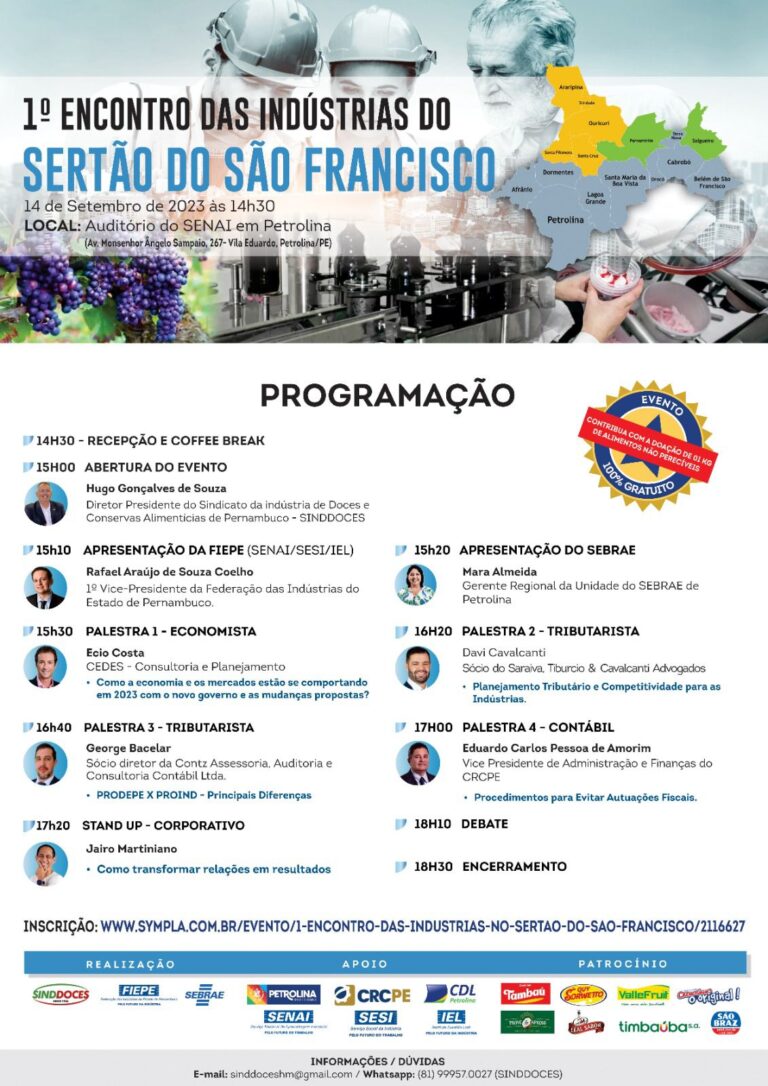 Inscrições:https://www.sympla.com.br/1-encontro-das-industrias-no-sertao-do-sao-francisco__2116627