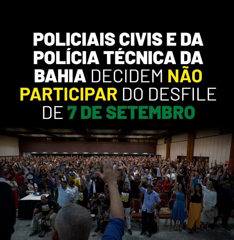 Em uma decisão unificada e firme, tomada durante assembleia na tarde desta sexta-feira, 06 de setembro, os Policiais Civis e da Polícia Técnica da Bahia decidiram, de forma massiva, não participar do desfile cívico de 7 de setembro, em comemoração à Independência do Brasil. O evento ocorreu na manhã deste sábado, entre o Largo do Campo Grande e a Praça Castro Alves, em Salvador.