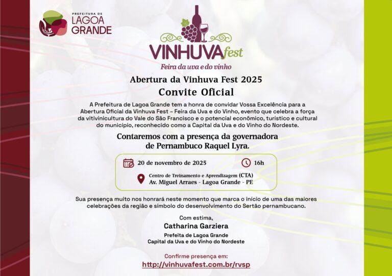 “Lagoa Grande está de portas abertas para receber todos com a hospitalidade que é marca da nossa cidade. Venham viver a VinhuvaFest, conhecer nossos vinhos, nossa cultura e celebrar o que somos: a Capital da Uva e do Vinho do Nordeste. Esperamos vocês de 20 a 23 de novembro!”, concluiu Catharina.