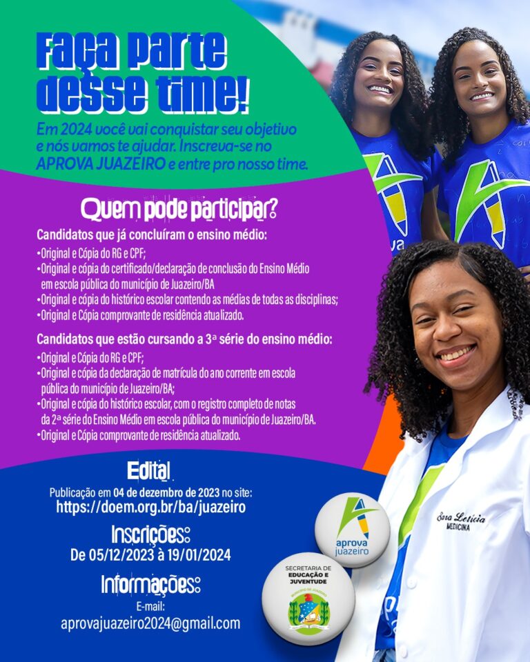 A Prefeitura de Juazeiro, através da Secretaria de Educação e Juventude (Seduc), inicia nesta terça-feira (05) as inscrições para a edição 2024 do programa Aprova Juazeiro. Pelo terceiro ano consecutivo, a iniciativa prevê a oferta de 200 vagas para o acesso gratuito de estudantes da rede pública de Juazeiro a cursos pré-vestibulares, com o objetivo de aperfeiçoar a preparação desses jovens para entrar na universidade.