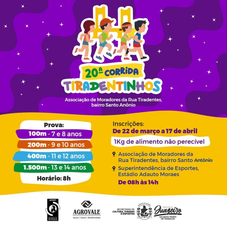 A Prefeitura de Juazeiro, através da Secretaria de Cultura, Turismo e Esporte (Seculte), vai abrir nesta sexta-feira (22) as inscrições para a 20ª Corrida Tiradentinhos. O evento, que tem a parceria da Associação de Moradores da Rua Tiradentes, será dia 21 de abril. A inscrição segue até o dia 17 de abril.