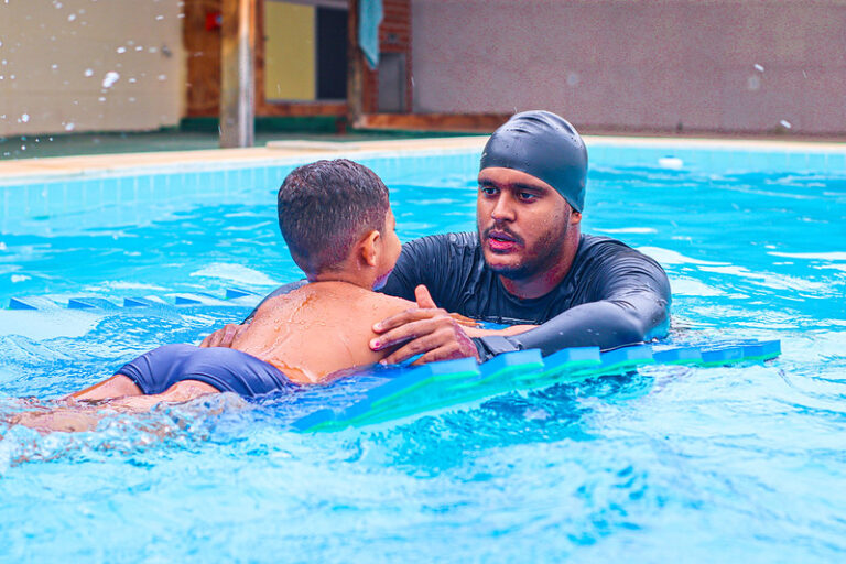 A recepcionista, Micaela Pereira de França, relata o impacto da natação no desenvolvimento do seu filho Arthur, 6 anos, que é autista de suporte 1. “A gente percebe que o desenvolvimento de Arthur, depois que ele entrou na natação, foi muito significativo, seja no aprendizado, na interação com os colegas ou na coordenação motora. Antes, ele não interagia muito, não conseguia correr. Agora, ele já corre, brinca e joga bola. Eu estou muito satisfeita com o atendimento, tanto do Espaço Humanizar, como da Escola Municipal de Educação Infantil (Emei) Caic Misael Aguilar. A assistência que temos é excelente”