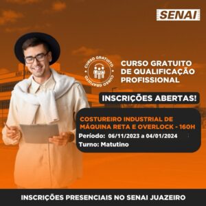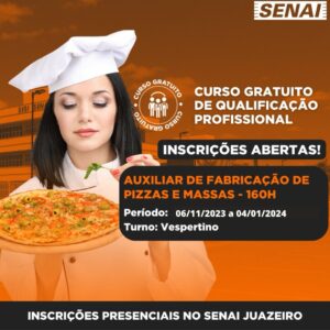 A Prefeitura Municipal divulga que estão abertas as inscrições para três cursos gratuitos de Qualificação Profissional no SENAI de Juazeiro. As aulas serão presenciais e iniciam na próxima segunda-feira (06). As capacitações têm duração de 2 meses e possuem carga horária mínima de 160 horas. Ao final do curso, os alunos aprovados receberão o Certificado de Qualificação Profissional.