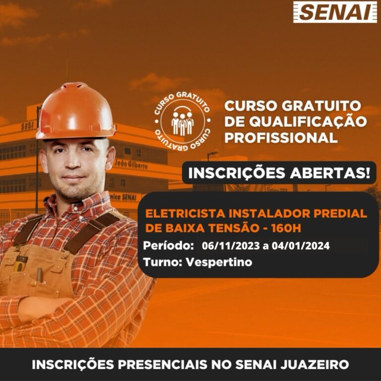 A Prefeitura Municipal divulga que estão abertas as inscrições para três cursos gratuitos de Qualificação Profissional no SENAI de Juazeiro. As aulas serão presenciais e iniciam na próxima segunda-feira (06). As capacitações têm duração de 2 meses e possuem carga horária mínima de 160 horas. Ao final do curso, os alunos aprovados receberão o Certificado de Qualificação Profissional.