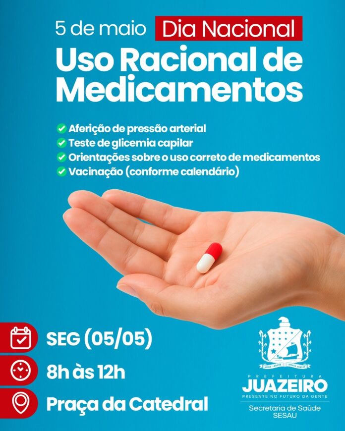 A Prefeitura de Juazeiro, por meio da Secretaria de Saúde/SESAU realiza, nesta segunda-feira (5), uma ação especial em alusão ao Dia Nacional do Uso Racional de Medicamentos. O evento acontece das 8h às 12h, na Praça da Catedral, com programação voltada à promoção da saúde e ao cuidado com a população.