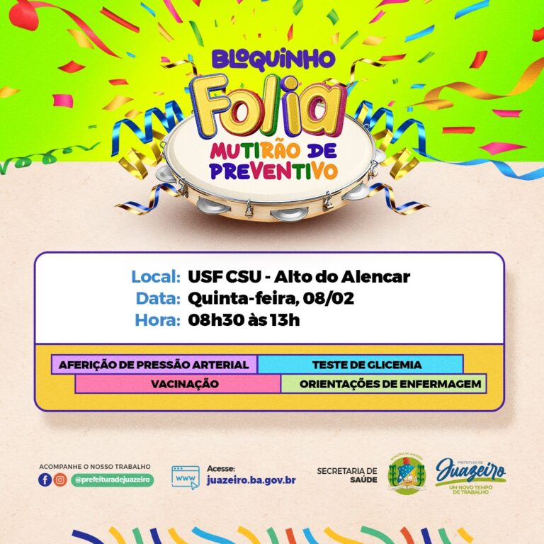 A Prefeitura de Juazeiro, através da Secretaria de Saúde (Sesau), vai realizar mais um mutirão de preventivos na Unidade Básica de Saúde do Centro Social Urbano UBS CSU, no bairro Alto do Alencar.
