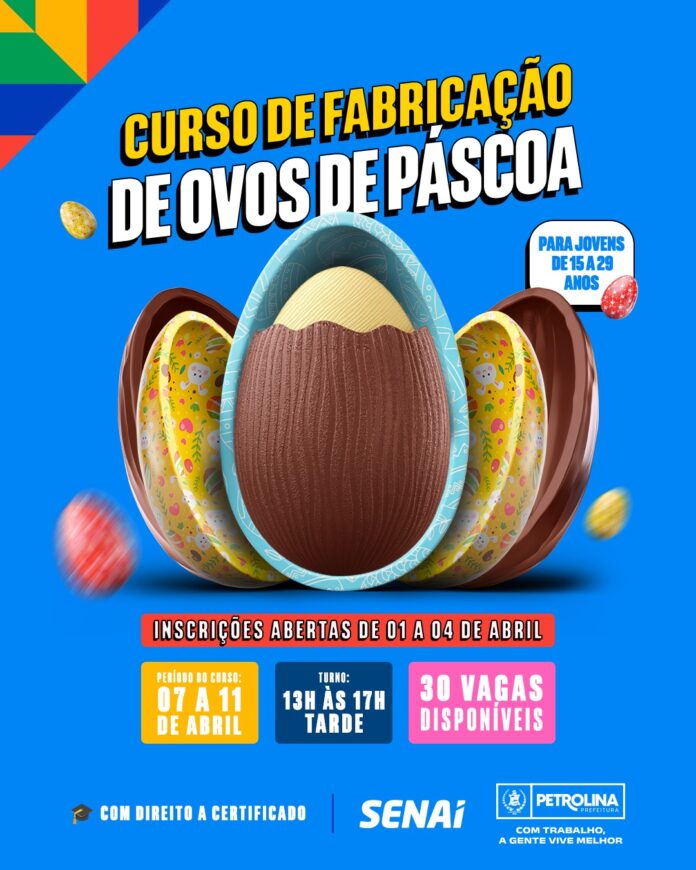 A Prefeitura de Petrolina, por meio da Secretaria de Assistência Social e Combate à Fome, em parceria com o Serviço Nacional de Aprendizagem Industrial (Senai), abriu inscrições para um curso gratuito de Fabricação de Ovos de Páscoa. A iniciativa tem como público-alvo jovens de 15 a 29 anos e visa capacitá-los profissionalmente, além de incentivar o empreendedorismo no município.