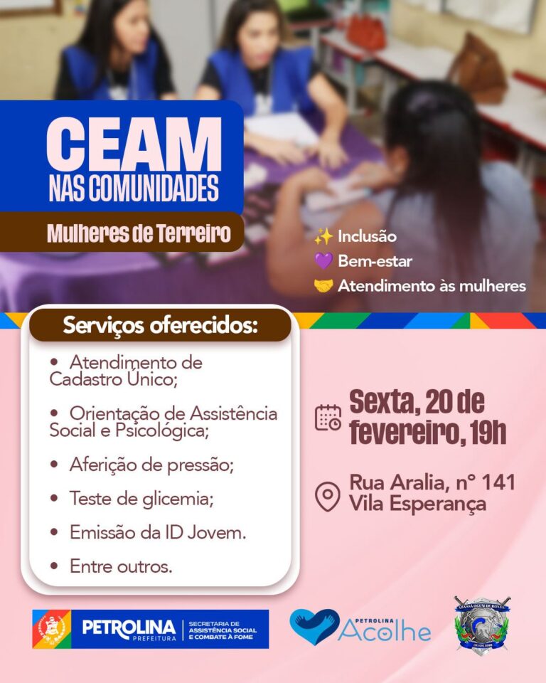 O cuidado chega onde ele é mais necessário. Nesta sexta-feira (20), às 19h, o bairro Vila Esperança será ponto de encontro para uma ação que une acolhimento, cidadania e respeito às mulheres das comunidades de terreiro de Petrolina. A iniciativa será realizada na Rua Aralia, nº 141, e faz parte do projeto “CEAM nas Comunidades”, promovido pela Prefeitura de Petrolina, por meio da Secretaria de Assistência Social e Combate à Fome. A proposta é aproximar os serviços públicos de quem mais precisa, garantindo acesso com dignidade e sensibilidade às realidades de cada território.