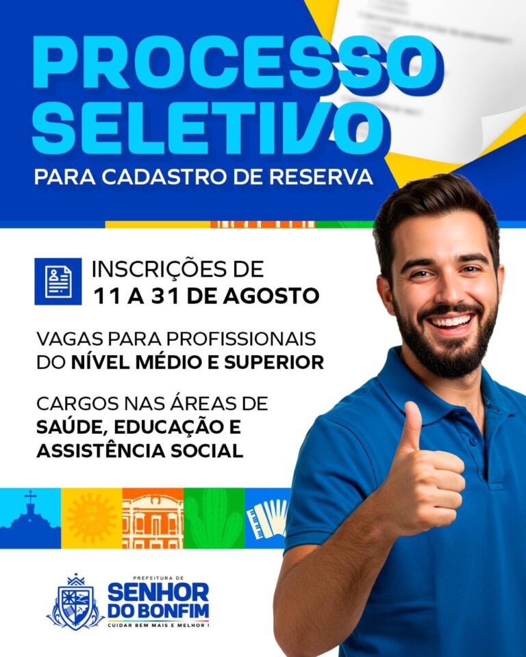 A Prefeitura de Senhor do Bonfim está com inscrições abertas para processo seletivo simplificado de contratação por tempo determinado, a fim de atender necessidade temporária de excepcional interesse público, para formação de cadastro reserva com diversos cargos de níveis médio e superior. As oportunidades abrangem funções ligadas às secretarias de Educação, Saúde e Assistência Social.