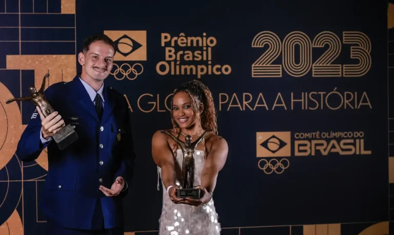 A Cidade das Artes, no Rio de Janeiro, foi o palco, nesta sexta-feira (15), do Prêmio Brasil Olímpico, que celebrou os feitos do esporte brasileiro no ano de 2023. E os grandes destaques da cerimônia foram o arqueiro Marcus Vinícius D’Almeida e a ginasta Rebeca Andrade, que foram escolhidos, respectivamente, como os melhores atletas masculino e feminina, recebendo o Troféu Rei Pelé.