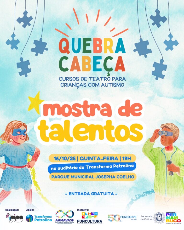 Há seis meses, o projeto “Quebra-cabeça” oferece cursos gratuitos de teatro para crianças com autismo em Petrolina (PE). Para celebrar sua primeira temporada, será realizada nesta quinta-feira (16) uma mostra de talentos. O evento tem entrada gratuita e começa às 19h, no auditório do Transforma Petrolina, dentro do Parque Municipal Josepha Coelho.