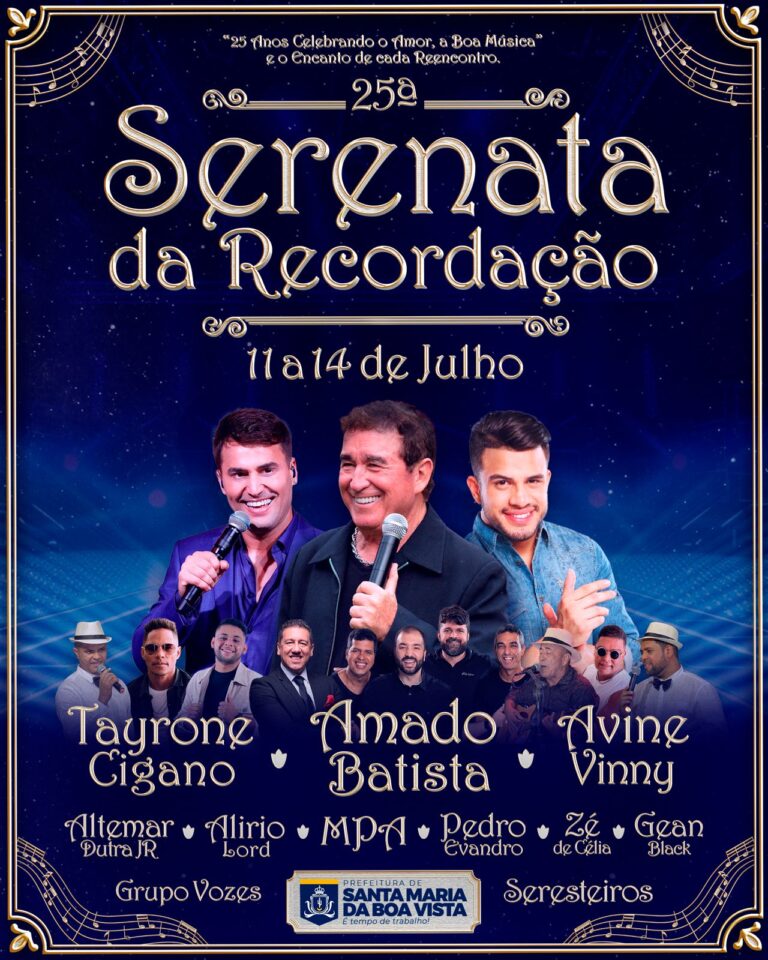 De 11 a 14 de julho, Santa Maria da Boa Vista irá realizar a 25ª Serenata da Recordação. Com o tema “25 anos celebrando o amor, a boa música e o encanto de cada reencontro”, o evento trará atrações de peso, a exemplo de Amado Batista, Tayrone, Avine Vinny, Altemar Dutra Jr. e os tradicionais seresteiros. A expectativa é que o festejo reúna cerca de 40 mil pessoas por noite nas margens do Rio São Francisco.