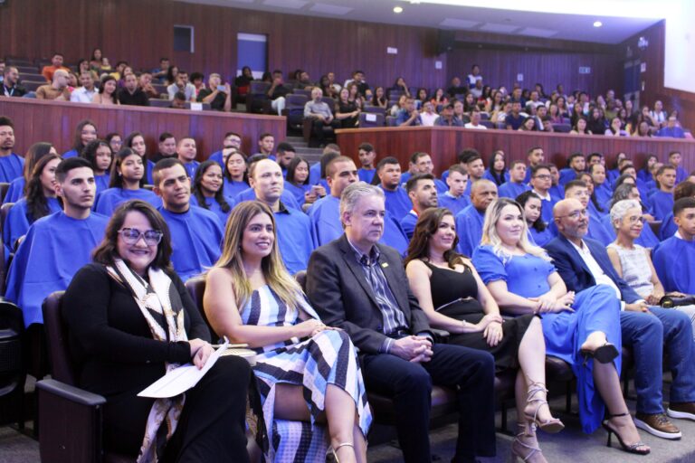 Após a leitura do juramento, feita por Davi Roberto Coelho, formando do curso técnico em administração, os novos profissionais receberam simbolicamente os diplomas por meio de representantes de cada um dos cursos.
