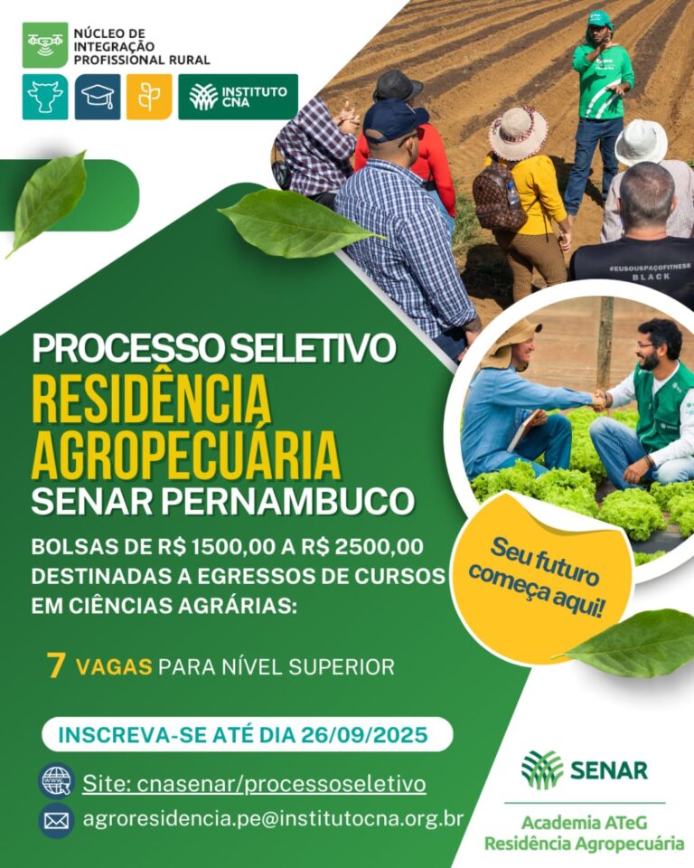 O Serviço Nacional de Aprendizagem Rural de Pernambuco (Senar-PE) abre inscrições gratuitas para o Programa de Residência Agropecuária, que vai oferecer 7 vagas para início em fevereiro de 2026. A iniciativa une teoria e prática no campo, capacitando jovens profissionais das ciências agrárias e fortalecendo sua inserção no mercado de trabalho.