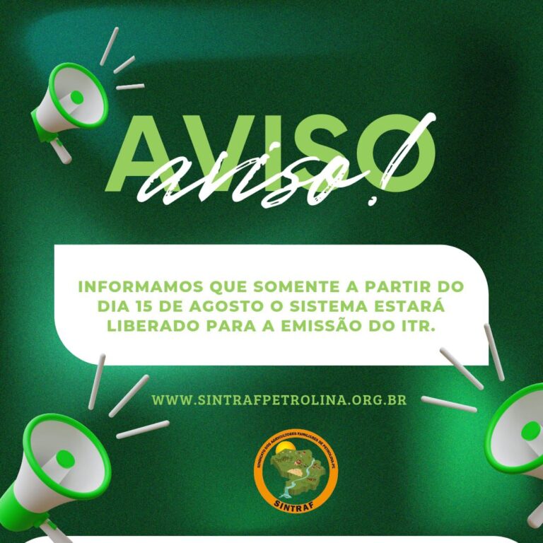 O Sintraf Petrolina, localizado à Rua da Simpatia, Centro da cidade, emitirá a partir do dia 15 de agosto, a Declaração do Imposto sobre a Propriedade Territorial Rural (DITR), basta estar em mãos do ITR 2023 e o documento CPF.