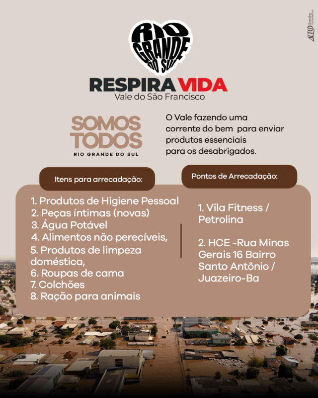 ‘Somos todos Rio Grande do Sul’, esta é a campanha de doação para vítimas das enchentes no RS, lançada em Petrolina – PE, nesta terça-feira (7), pelo grupo de voluntários ‘Respira Vida VSF’. A ação solidária visa arrecadar donativos, a exemplo de água potável, alimentos não perecíveis, produtos de higiene pessoal, itens de limpeza doméstica, […]