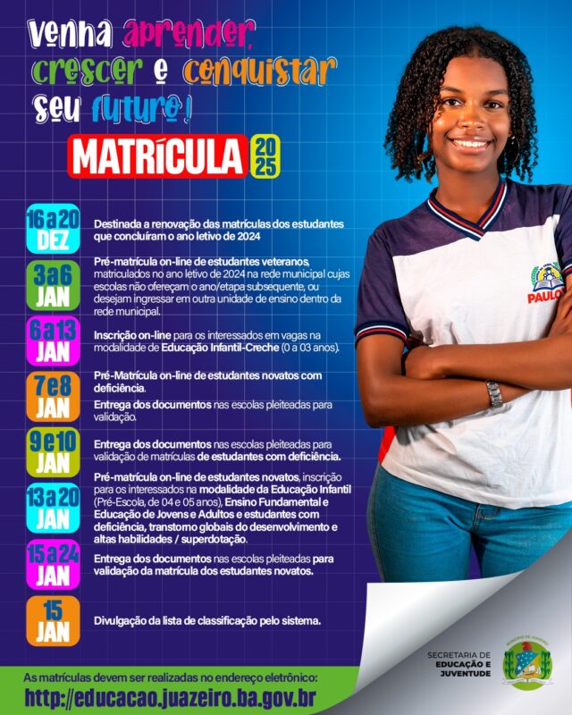 Conforme publicado em portaria do Diário Oficial do Município (Doem), pela Prefeitura de Juazeiro, através da Secretaria de Educação e Juventude (Seduc), as matrículas referentes ao ano letivo de 2025 na rede municipal de ensino, iniciam na próxima segunda-feira (16). A primeira etapa do calendário inicia no dia 16 de dezembro e vai até o […]